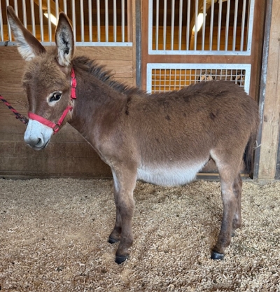 Farmstead's Homer Hickam is a beautiful dark red jack born on June 8, 2025. Homer's Mother, Farmstead's Hattie Hasseltine, is a frosted spotted white jennet that is producing beautiful red show donkeys for us. Her first foal has been a consistent winner in the show arena, being named the winner of the large two year old jennet class at the 2024 NMDA National Show in Springfield, MO. Hattie's second foal, Farmstead's Ray Hicks, a yearling gelding, has just begun to show and is doing quite well. Homer is Hattie's third foal and much is expected from him in the show arena in the future. Homer's Daddy is our handsome red jack, Country Music's Rusty Weir, an own son of the well-known Country Music's George Jones, now deceased. Rusty has sired many winners in the show arena, and Homer will definitely be taking home the awards as he begins to show in the years ahead.